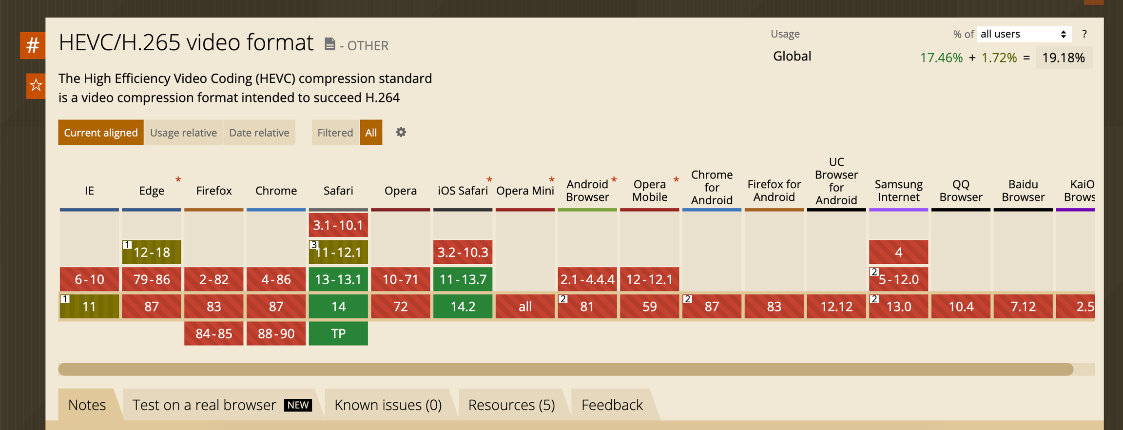 以下是现代浏览器版本对 H.265 的支持度 (绿色为可用,红色不可用,黄色需加兼容前缀)
