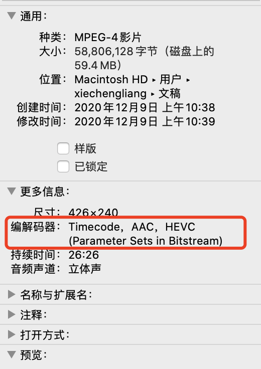 有了以上的定论,我们开始去做文件的溯源,发现了这个视频是 HEVC(H.265)编码,而物料中能够正常被 ios 播放的视频编码为 H.264
